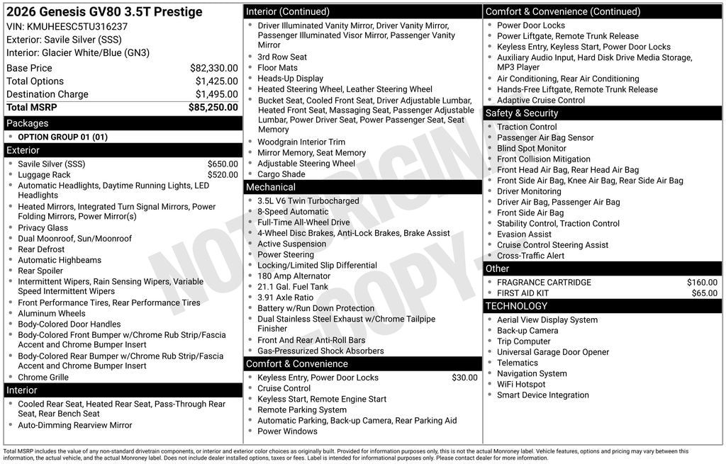 Silver 2026 Genesis GV80 3.5T Prestige AWD 8-Speed Automatic 3.5L DOHC GV80 3.5T Prestige, AWD, 3rd row seats: split-bench, Auto High-beam Headlights, Auto tilt-away steering wheel, Auto-dimming door mirrors, Auto-dimming Rear-View mirror, Brake assist, Bumpers: body-color, Electronic Stability Control, Exterior Parking Camera Rear, First Aid Kit, Heads-Up Display, Heated & Ventilated Front Bucket Seats, Heated rear seats, Heated steering wheel, Illuminated entry, Leather steering wheel, Memory seat, Nappa Leather Seating Surfaces, Navigation System, NFC Key Card, Panic alarm, Power door mirrors, Power Liftgate, Power moonroof, Rain sensing wipers, Remote keyless entry, Spoiler, Steering wheel memory, Steering wheel mounted audio controls, Turn signal indicator mirrors, Wheels: 22" x 9.5J Dark Gray Matte Alloy.